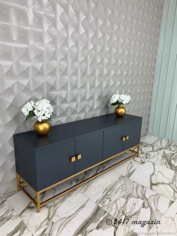 ميز تصميم منتصف القرن لهذا الطاولة بحواف مشطوفة، وقطع معدنية مطلية باللون الذهبي تعود بجذورها إلى حداثة فترة الخمسينيات والستينيات. كما يشمل 4 أدراج وخزانتين ،فيتسع بهم لجميع أواني وأدوات تناول الطعام وأواني التقديم، وبياضات مائدة الطعام بالإضافة إلى الكتب والألعاب